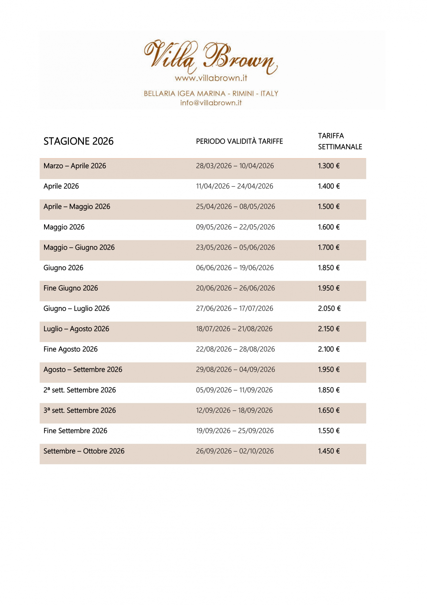 (le tarfiffe si intendono per settimana per l'intera Villa, fino ad un massimo di 6 ospiti, comprese le utenze, escluse spese di pulizia finali di 50€)